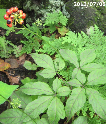 地上部はオタネニンジンに良く似て、茎を1本だけ立て、高さ50~80cmになり、茎頂に長い葉柄のある掌状複葉を3~5枚輪生します。
