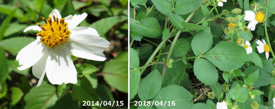 サトウキビ畑の強害草にもなっていて、侵略的外来種ワースト100のひとつとされます。 茎は直立して高さ50~150cmになり、4~6稜があり、淡緑色でときに暗紫色を帯びます。 葉は下部で対生、上部で互生し、葉身は羽状複葉、長さは7~15cm、小葉は3~5個、卵形から卵状楕円形です。 小葉の先は尖り、基部は丸いか漸鋭尖形、縁には鋸歯があります。 ほぼ周年開花して、頭花は黄色い筒状花に大きな白い舌状花が5~8枚つき、花径は3cmほどになります。 花数が多く、コシロノセンダングサ より花が大きいので目立ちます。 雄しべ5個、雌しべ1個、総苞片はへら形で、8~10個程度がつき、先端部分が反ります。 果実 ( 痩果 ) は平たい四稜形で、頂部の芒 ( 棘 ) は2~4個あります。 |