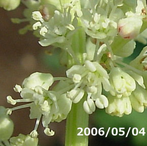 葉柄は多肉質で太く、酸味があって、ジャムなどに利用できるため、ショクヨウダイオウ ( 食用大黄 ) とも呼ばれます。 4月~5月に花茎を立て、茎頂と葉腋に大きな円錐状花序を作り、淡い黄緑色の小花を多数つけます。 小花柄で花軸に輪生し、花弁はなく、ガク片6個、雄しべ9個があり、花被片から突出します。 雌しべは1個で、短い花柱が3個つきます。 |
