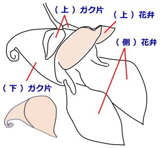 下ガク片は、後方に向かって細い距になって蜜を溜め、距は内に巻きます。 花弁は ( 上 ) 花弁1個と、( 側 ) 花弁2個があり、上花弁は、下ガク片の開口部から出て斜上し、中央は肋状になって折れます。 側花弁は下ガク片の先で横に張り出して突出し、先端は尖り、側花弁2個が並ぶと、唇弁が2裂したような形状になります。 |