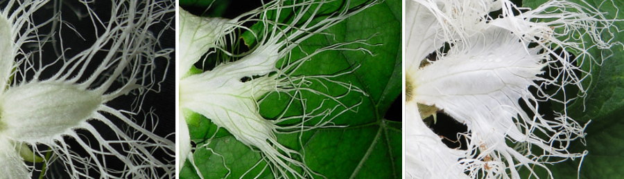 葉は互生、葉身は心形~広心形で掌状に3~5裂し、光沢はなく、表裏とも短毛が密生してザラつきます。 雌雄異株で、上部の葉腋に、ふつう雌花は1個、雄花は数個の花をつけます。 ガク筒が長く、雄花は長さ10cm近くになることもあり、雌花は5~7cm、基部には楕円状に膨らむ子房がつきます。 花冠はふつう5裂して、縁はさらに細長く裂け、白色のレースを想わせる形状をしています。 雌花は淡緑色の柱頭が3裂して、先がわずかに花冠から覗きます。 雄花は雄しべが3個あり、花筒の内壁について花糸は短く、黄色の葯は集まって円柱状になります。 花は夏季の日没後、暗くなってから咲き始め、翌早朝にはしぼみます。 |