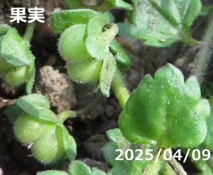 ヨーロッパ原産の2年草で、現在では北海道から沖縄まで広がっているとされる帰化植物です。 全体的に白く長い毛があり、茎は分岐して、横に這ったあと、先を立ち上げます。 葉は互生、葉身は広楕円形~卵円形、2~4個の鋸歯があり、縁には白い毛がつきます。 花期は4月~5月、陽だまりでは、3月ころから咲き始めます。 花冠は4深裂し、花径は4~5mm、花は青紫色の筋があり、花期の花柄は短いため、葉に乗るような位置で開きます。 未熟な果実は、初め長い縁毛のあるガクに包まれて、三角形をしています。 熟すにつれて果柄が伸び、果実は長さ3mmほどの先端がやや窪んだハート形になります。 |