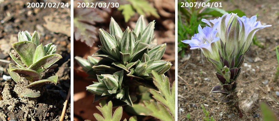 根生葉が小さいため、ロゼット状にならないことが、ハルリンドウやコケリンドウと異なります。 花期は4~5月、花冠は漏斗状の釣鐘形で、先は5裂し、リンドウ属の特徴である裂片の間にある副片は先端に浅い切れ込みが入ります。 花冠は長さ2cm前後、淡青色から青紫色で、内側には暗紫色の斑点があります。 雄性先熟で雄しべは5個あり、花粉を放出後に雌性期に入って、雌しべの柱頭が2裂します。 ガク筒は長さ1.5cmほど、先は5裂して裂片は披針形、先は尖って花筒に添うようにつきます。 果実は蒴果で宿存するガクから突出して、熟すと2裂し、小さな種子を出します。 花冠の白い品種に、シロバナフデリンドウ Gentiana zollingeri f.albiflora があります。 |