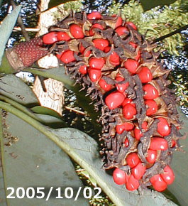 材質が均一で軽く加工しやすいことでも知られ、建具や下駄の歯 ( 朴歯下駄 ) などに利用されています。葉は節間の詰まった互生で、枝先に輪生状にまとまってつきます。 葉身は倒卵形~倒卵状楕円形、長さは20~40cm、先は鈍頭から微突形になります。 縁はやや波打ち、表面は白みを帯びた緑色、裏面は灰緑色で、葉柄は3~4cmあります。 ![]() 花は在来種の中でも大きいもののひとつで、5~6月ごろ、枝先に直径15~20cmの花をつけ、上向きに開きます。 花被片は白色で淡い黄色を帯び、がく片と花弁の区別がつかない9~12個が平開し、強い芳香を放ちます。 花の中心にある花托の上側に多数の雌しべが、下側に雄しべ群が螺旋状につきます。 雄しべは花糸が赤紫色で葯はクリーム色、雌しべも赤紫色になります。 果実は袋果が多数集まって長さ10~15cmほどの楕円状になり、種子は赤く熟します。 |