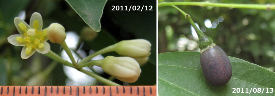 裏面は脈が隆起し、淡い緑色、葉柄の長さは1~2cmあります。![]() 5月~7月、葉腋に集散花序を出し、多数の淡黄色の小花をつけます。 花被片は卵状長円形で6個あり、花径は小さく5mmほど、雄しべは9個、雌しべは1個、花柱は細く柱頭は小さく、次項の2種より目立たないサイズです。 果実は楕円体の液果で、長さは1cmほど、黒紫色に熟します。 |