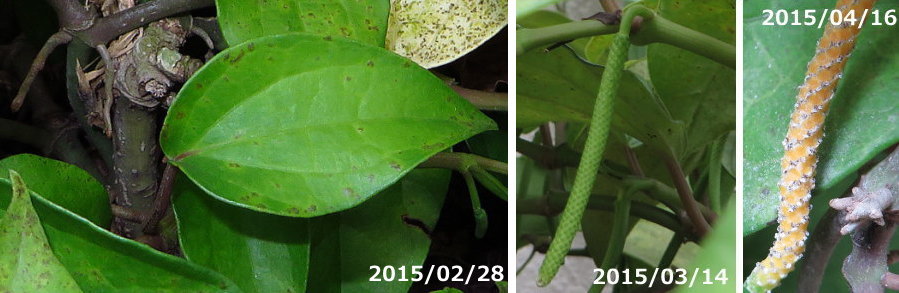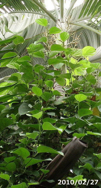他物に絡んで高さ20mまで登り、あるいは地表を這っって広がり、一部でやや木質化します。 葉はふつう互生してつき、葉身は広卵形で長さ5~20cm、先は急に細くなって尖り、基部は浅い心形です。 表面はやや黄色を帯びた緑色で光沢があり、両面ともほぼ無毛、厚く革質、全縁で縁は波状になります。 葉柄は2~5cm、微細な毛がまばらにつきます。 花序は葉と対生してつき、長さ2~3cmの花柄の先に、円筒形の穂状花序を下垂します。 雄花序は長さ10cmほどあり、白から黄色の目立たない小さな花を、多数らせん状に並べてつけ、雄しべは2個あります。 雌花序は長さ3~6cmで、直径1.5~1cmほど、柱頭は4~5個あり、果実は核果で、結実は稀とされます。 ( 雄しべ、雌花序、果実の項は、下記の参考資料による。 なお、画像の花序は、長さから雄花序と推測するが、確認できていない。) |
