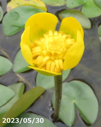 円柱形の長い葉柄につき、水量が減少すると、浮葉は葉柄にささえられたまま水面上に出て、抽水葉の形になります。 花期は6~9月、花は黄色で椀型、直径3~4cmあり、水面から出る長い花茎に1個つき、上向きに咲きます。 花弁様の大きなガク片5個、花弁は小さな長方形をして、10数個が一列に並んでつきます。 雄しべは花糸の幅が広く多数あり、雌しべは柱頭盤になります。 |
