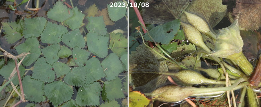 ヒシ ロゼット状の浮葉 / 葉柄の浮嚢と未熟な果実 撮影:東京都水元公園![]() |
