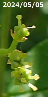 花期は4月~5月、葉腋の花序に淡黄色の小さな花をつけます。