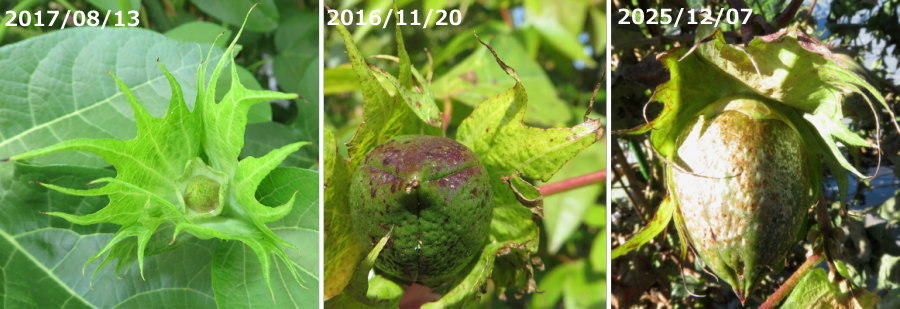 果実は卵形で長さは5cmほど、先が尖り、熟すと果皮が裂開して白色の綿 ( コットンボール ) が現れます。