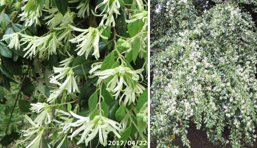 のちに、日本でも自生地が発見され、自生品は数が少ないため珍木扱いされています。 枝を多数分けて樹形は密に繁り、若い枝には短毛がつきます。 葉は互生、葉身は卵状長楕円形、長さは5cmほど、先は微突起状になります。 全縁で皮質、表面は光沢があり、葉裏はビロード状に白い毛が密生します。 花期は4~5月、葉腋に花序を出し、小花を3個~5個程度つけます。 小花は4弁花で花弁はリボン状、長さは2~5cm、白色にごく淡い黄色を帯びて、光沢があります。 満開の時期には、木が雪をかぶったように白くなります。 雄しべは4個、雌しべ1個、先は短く2裂し、ガク片4個は、淡黄緑色で短毛が密につきます。 |